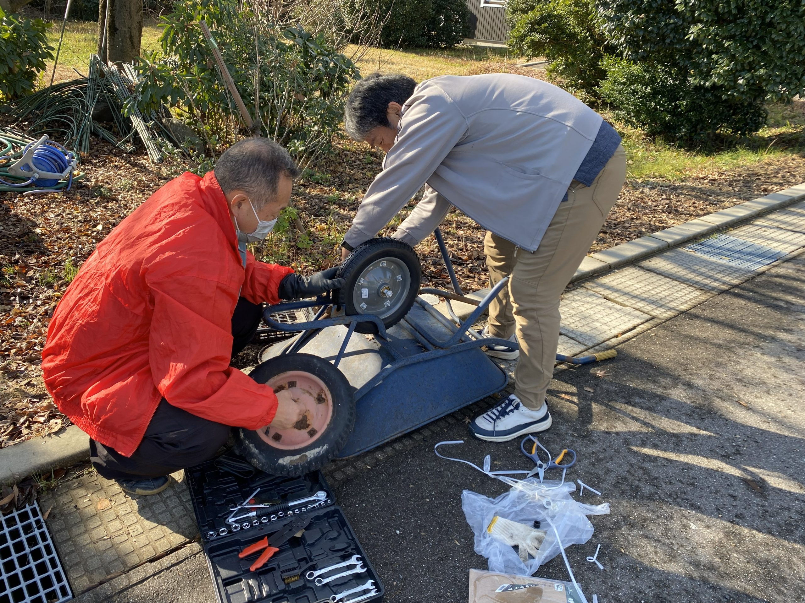 現地に到着すると、スタッフさんが一輪車の車輪を新しいものに交換されていました。今日は、雪で植物が覆われる前に宿根草の剪定をするので、剪定枝を運ぶ一輪車を動きやすくして下さっているのです。スタッフさんに感謝です。