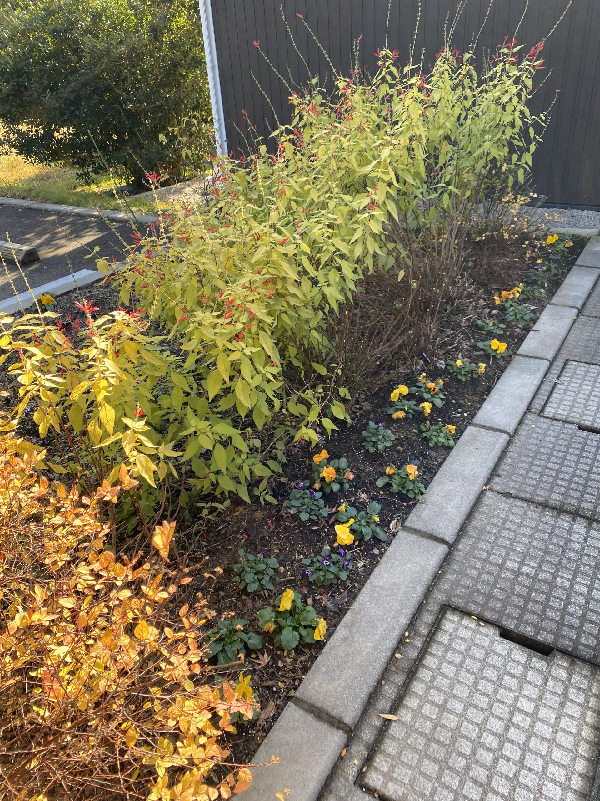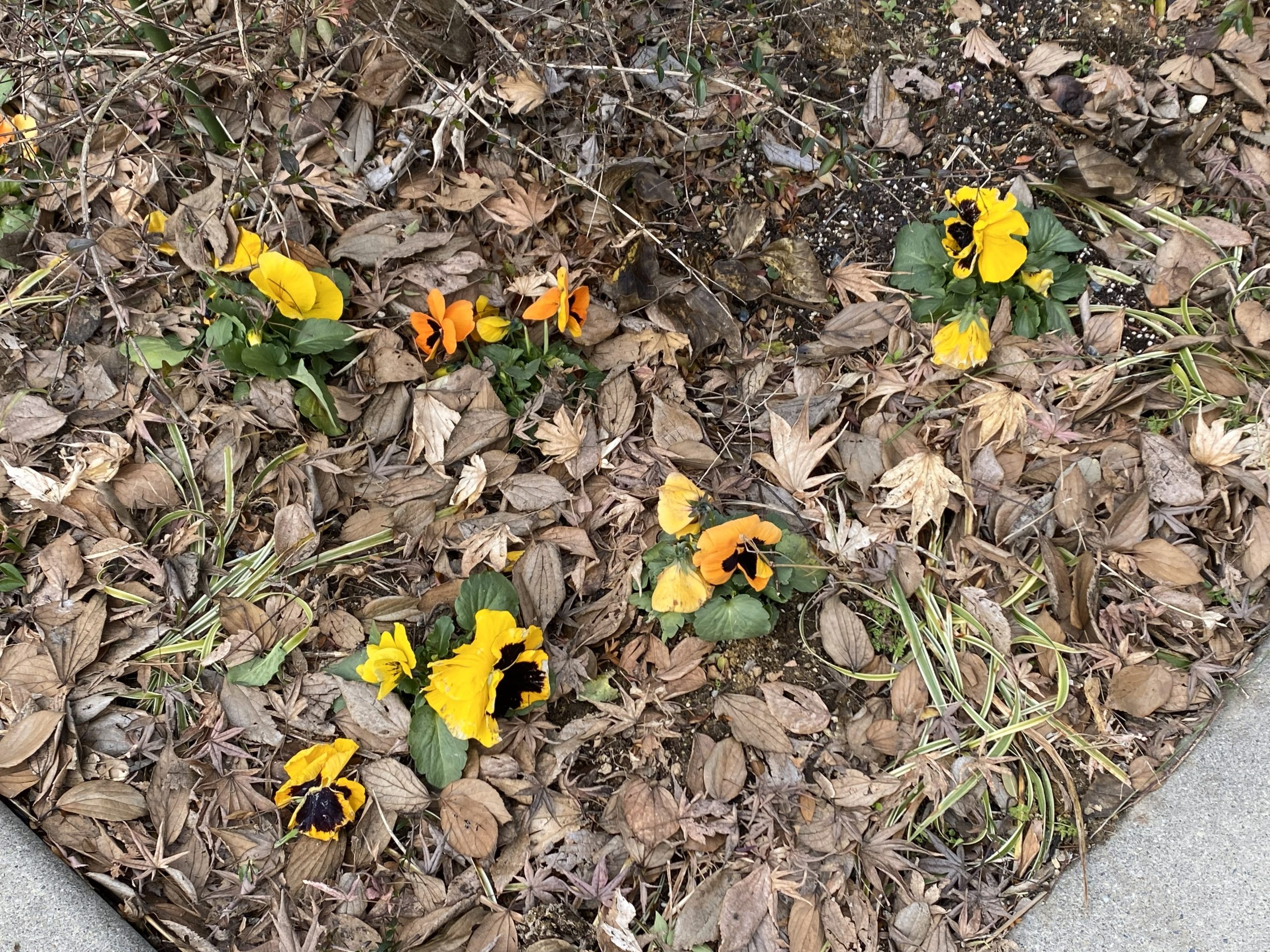 ふとガーデンの足元をみると、先月地域のかたと植えたパンジーが落ち葉の中に見え隠れしています。