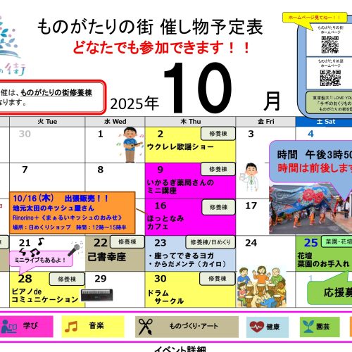 2025年10月の 「ものがたりの街の催し物」 「ものがたり倶楽部ハウスの予定」 更新しました